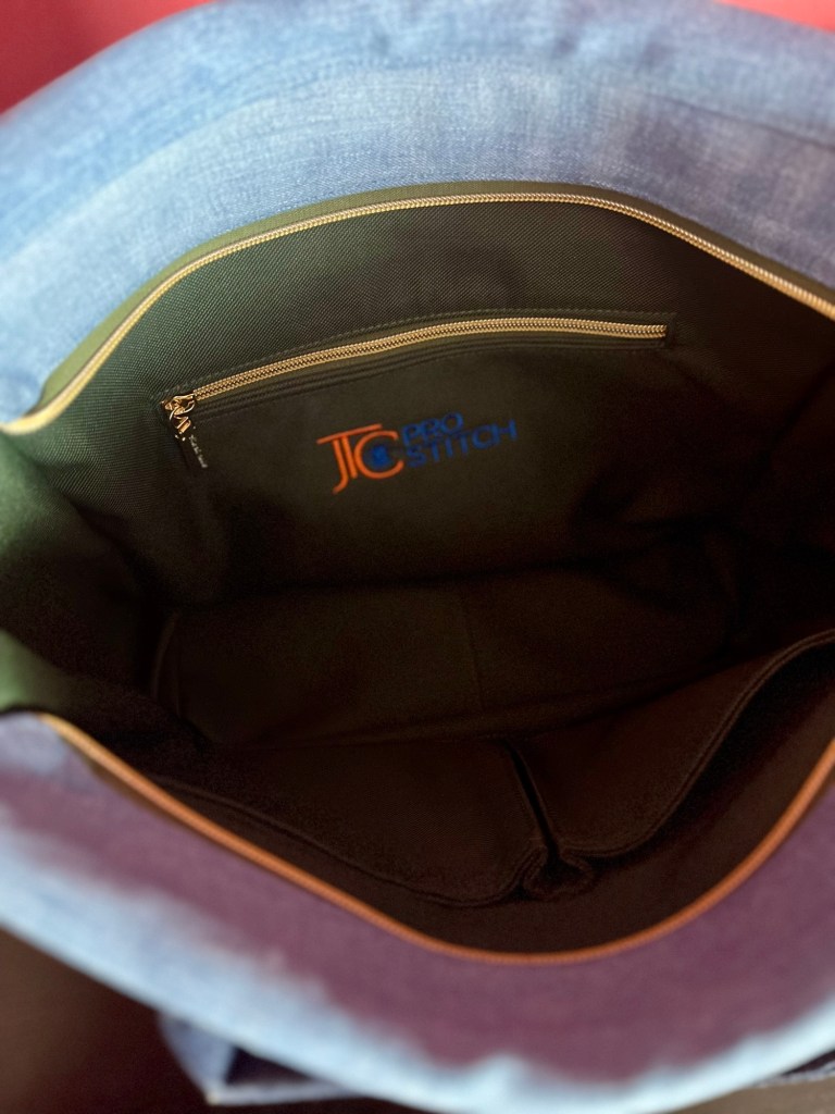 I absolutely love how much space is in this bag. I customize the interior to add a zipper pocket with our logo and two slip pockets to easily add my cellphone.