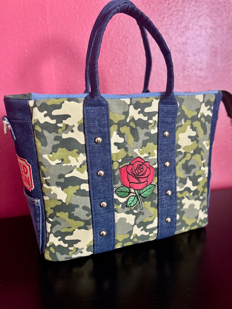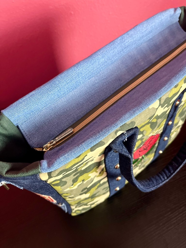 I had plenty of jeans and fabric in my stash to work with so all I need is a handbag pattern and some bag hardware to customize this tote bag piece. With a little inspiration from Pinterest I decided to go with Simplicity S9618 this pattern comes in three sizes, I cut out the medium tote bag for this project . The pattern is great overall but I add a few features like a bottom gusset, main zipper closure, zipper pocket and slip pocket.